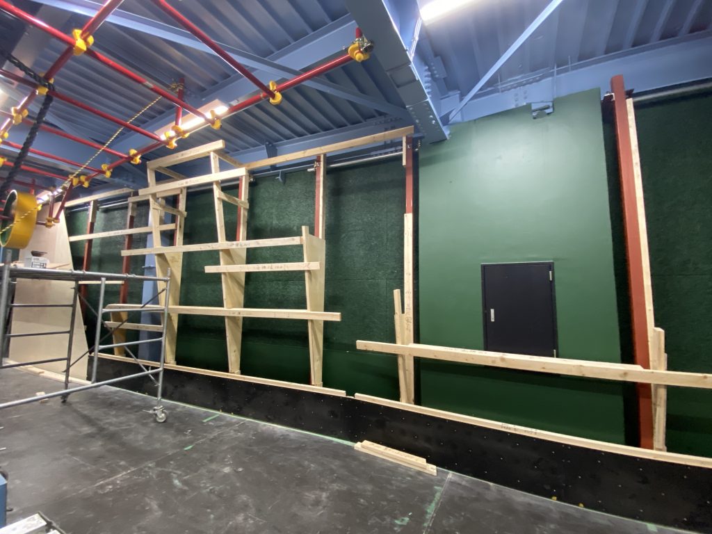 壁施工にあたり、壁近くまであった単管やアトラクションは移動してもらい、天井ぎりぎりまで壁を建てます。今回は角パイと2×4材で骨組み。
